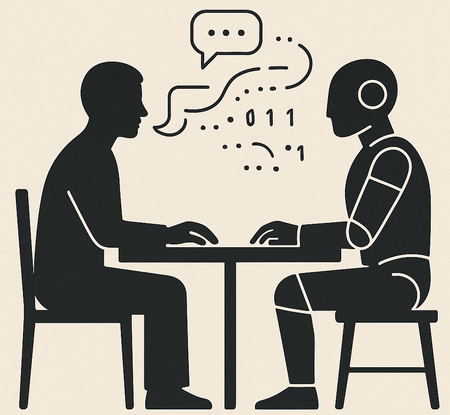 Visual: Two minimalist silhouettes (human + AI head/brain) sitting across a digital table with conversation lines connecting them.