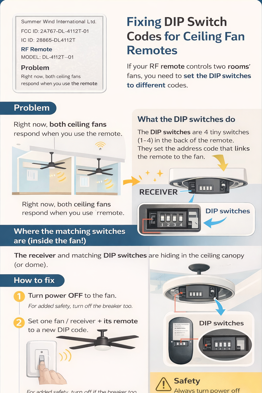 To stop “one remote controls both rooms,” you only need to change ONE fan/receiver + ONE remote to a new DIP combo (even flipping a single switch is enough), and leave the other room’s fan/remote on the old combo.
