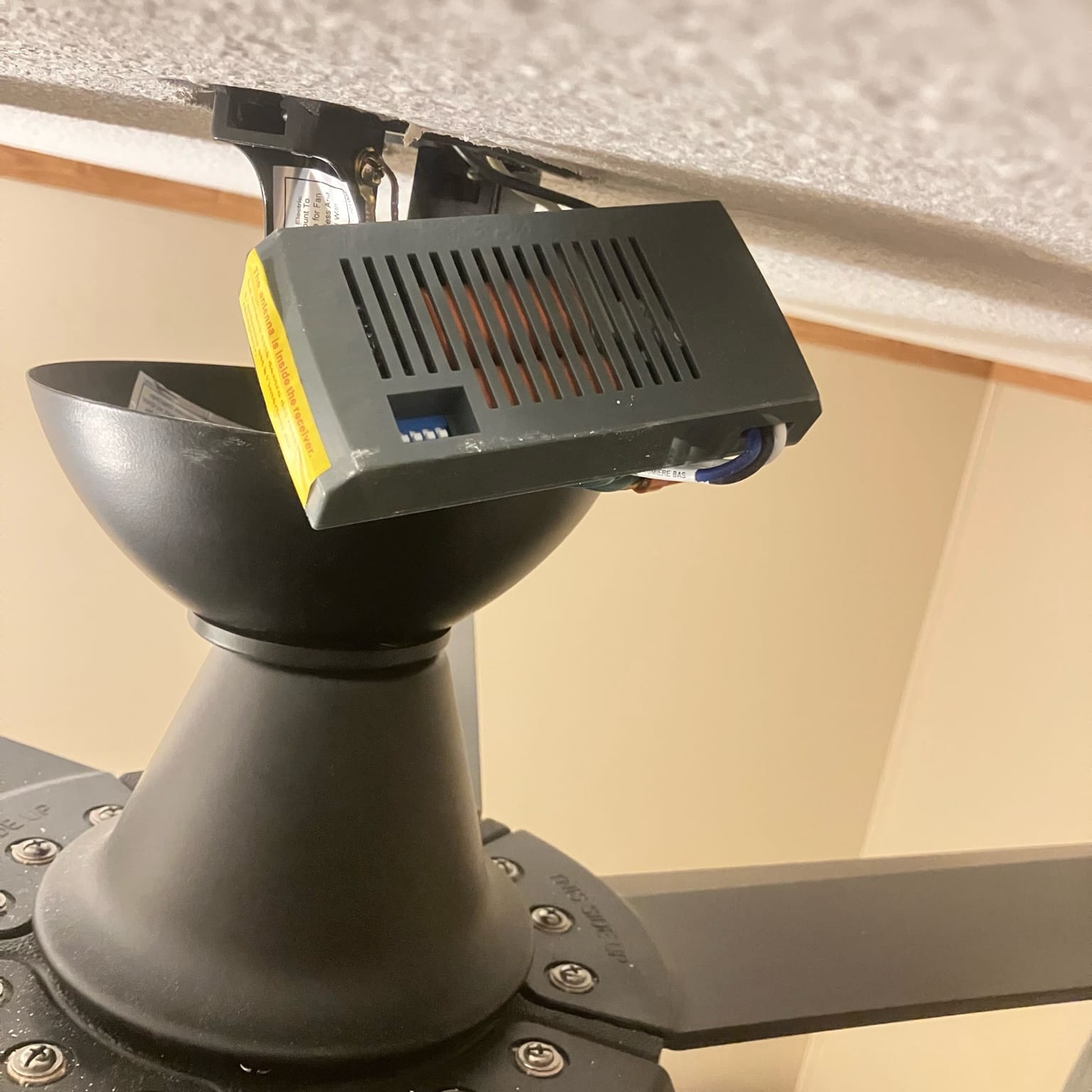 They’re not on the visible underside of the fan. On systems like this, the “code” switches live on the receiver module that’s tucked up in the ceiling canopy / hanger bracket area (the part right at the ceiling above the downrod).