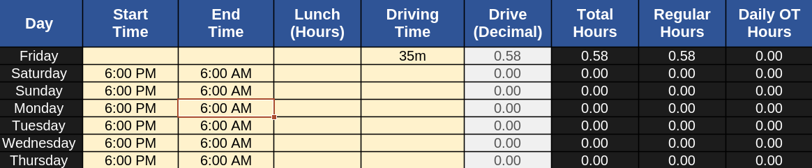 I tested your timesheet and see the driving time formula works on LibreOffice. But I noticed an issue. As you can see in this screenshot, if I work 6PM to 6AM the timesheet is not even calculating these or doing anything. What the best way to handle this situation. Obviously, your timesheet works for the day shift person working 6am to 6pm but not for the night shift where the hours overlap onto the next day. Don't generate any new files until we are done discussing how we should go about this.