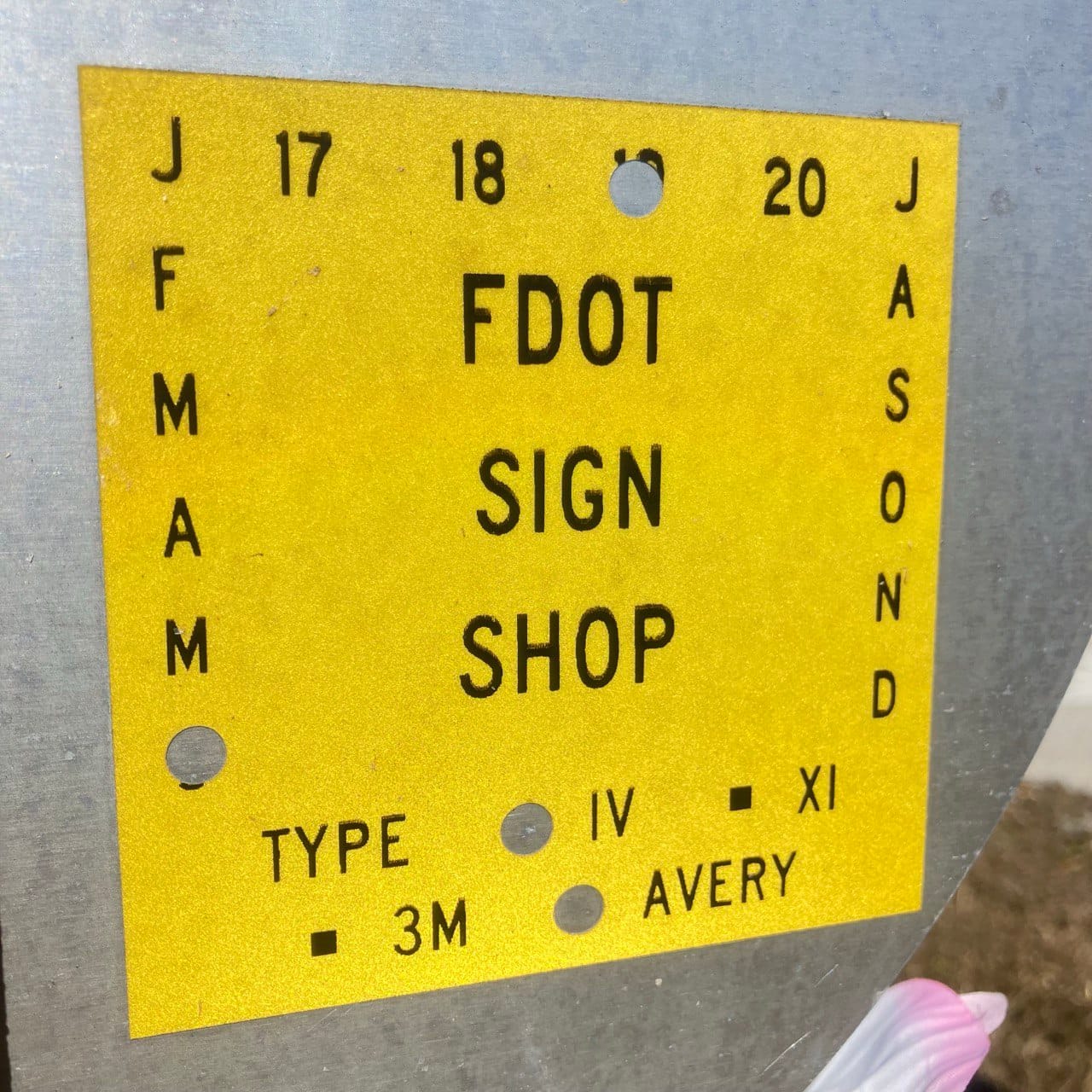 On the back of these two signs is a yellow Florida Department of Transportation sticker that says FDOT SIGN SHOP with holes punched on June 2019. TYPE IV and AVERY also have holes punched in them. What does that mean? Note: XI and 3M do not have holes punched in those parts of the sticker.