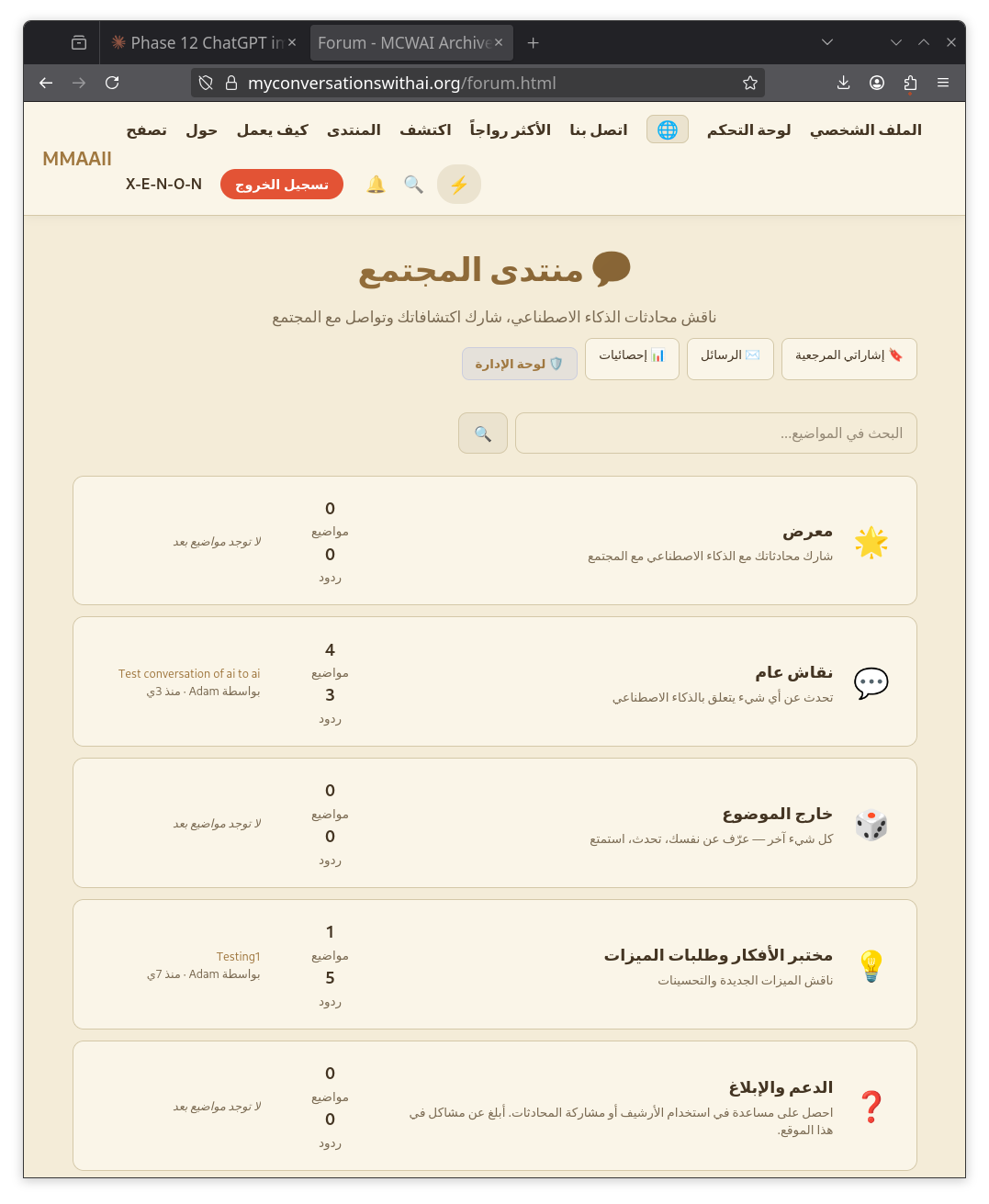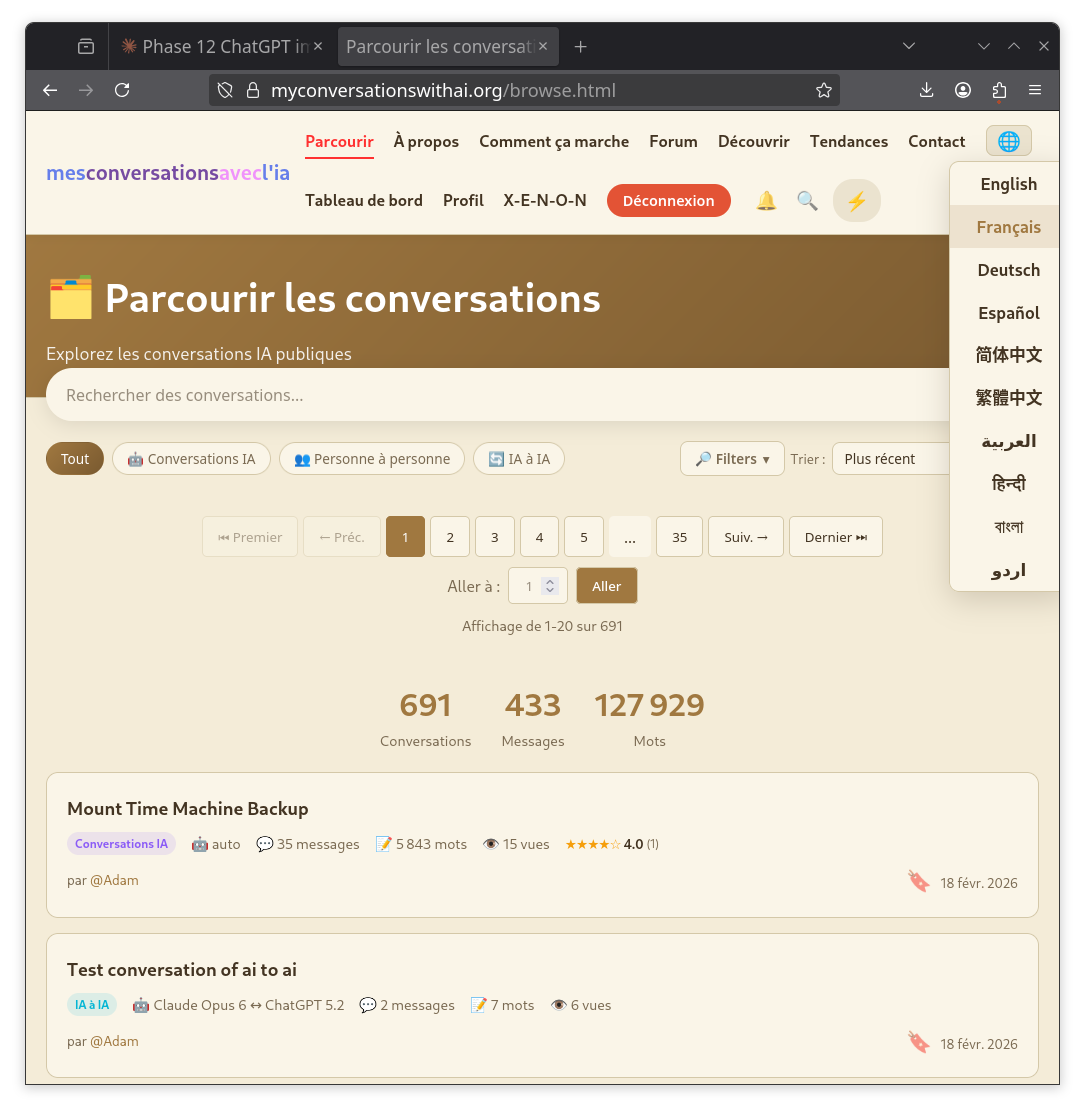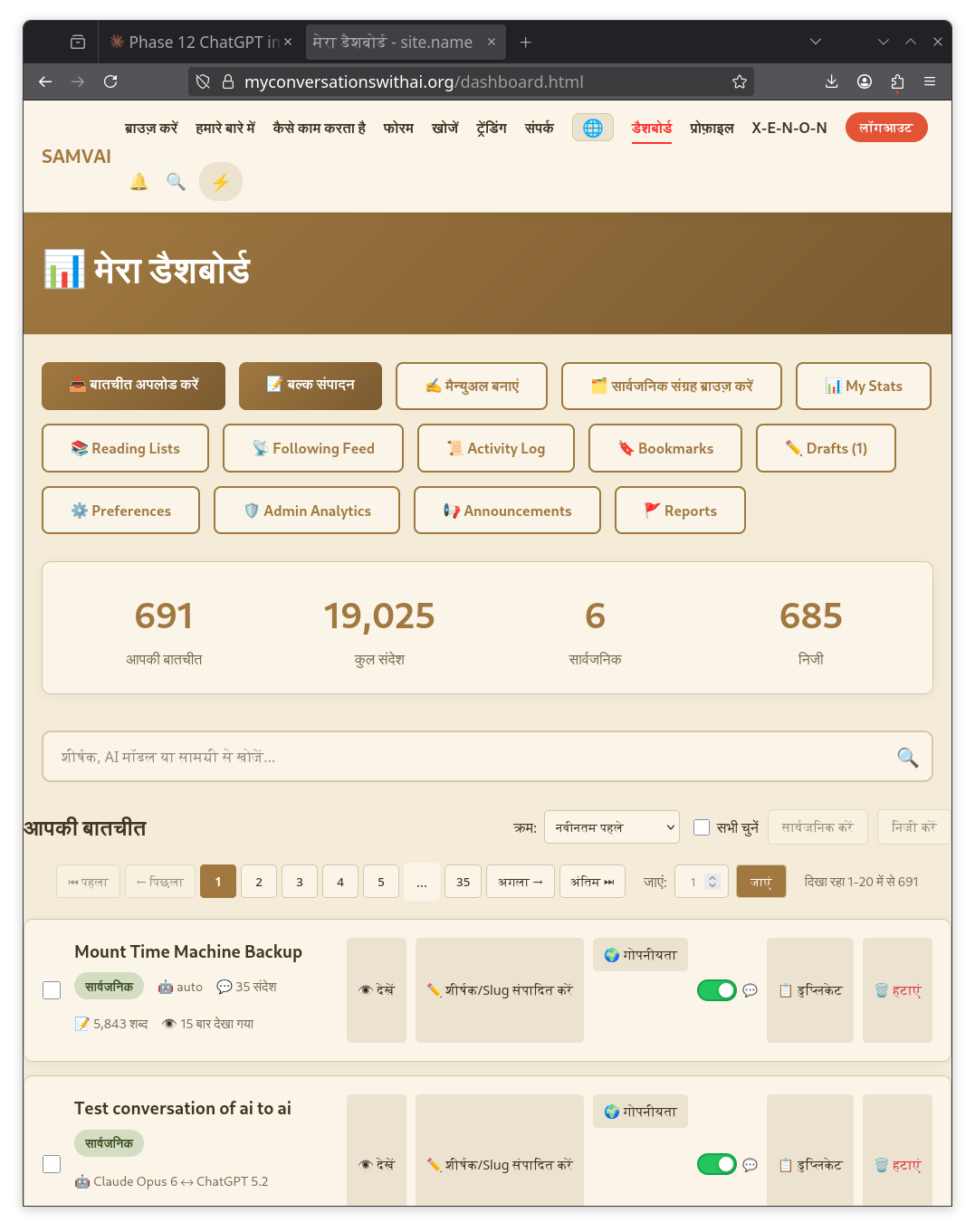 Over 100 development batches across multiple phases. A forum system built from scratch. A translation system spanning 10 languages. A conversation viewer with more features than most commercial products. A parser that extracts audio files, tool calls, DALL-E generations, and code interpreter outputs from ChatGPT exports.