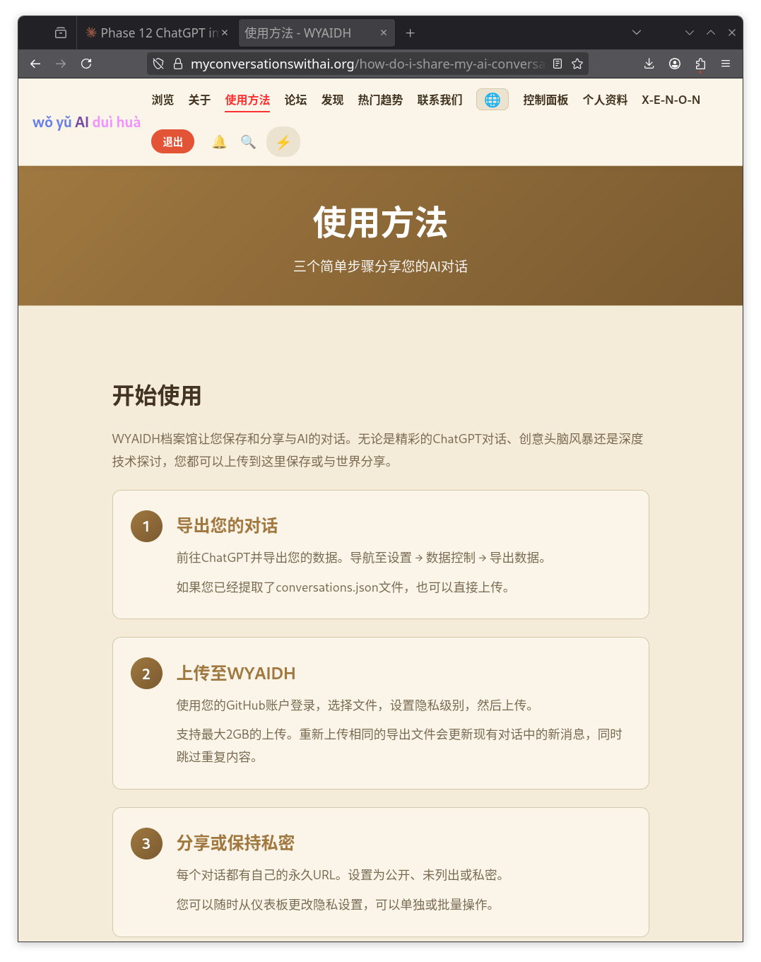 Upload a ChatGPT export. Create a conversation manually. Browse what others have shared. Join the forum. Switch to your language. Make it yours.