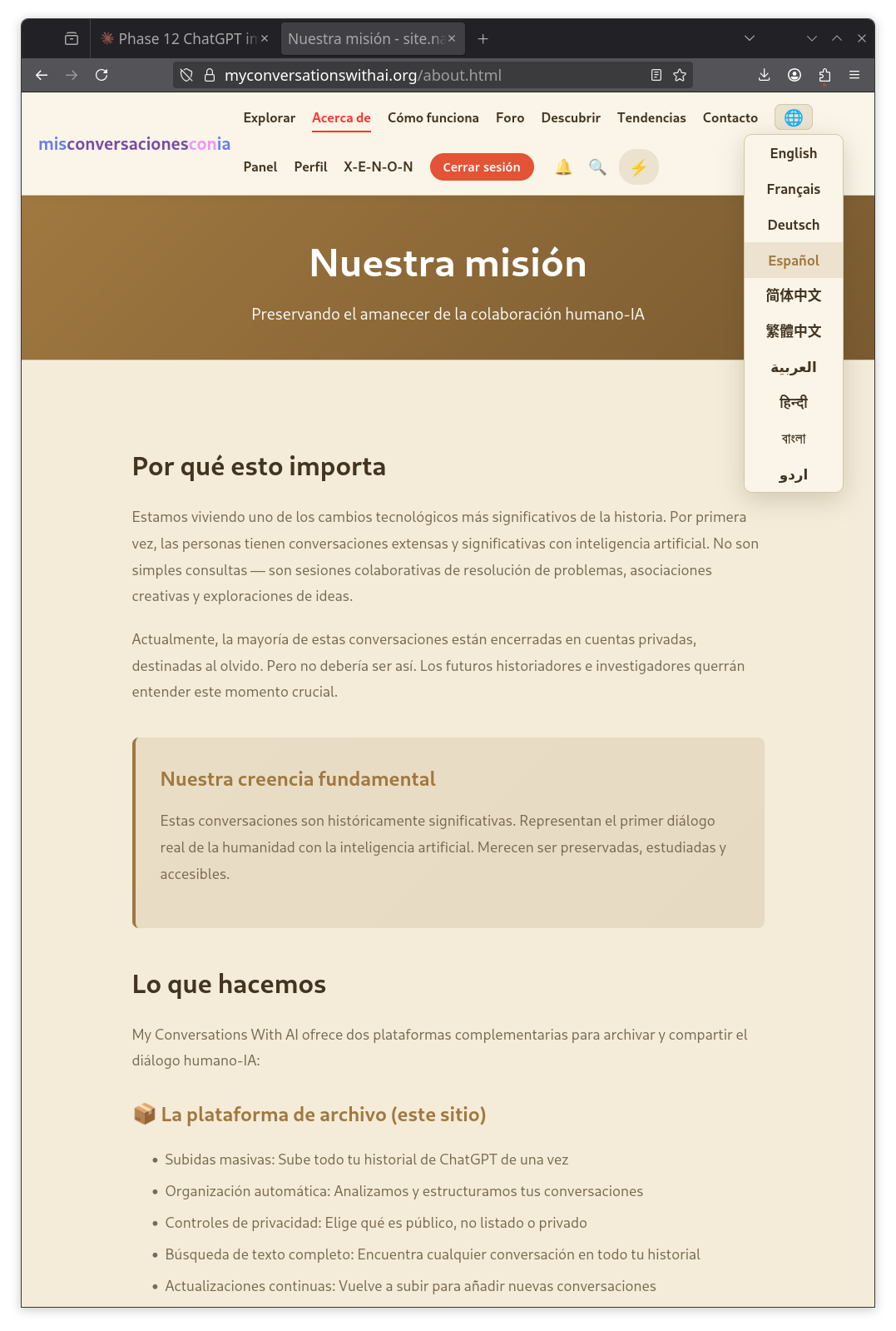 And here's the philosophy that drives it: all languages live on one domain, one database, one community. Not fragmented across separate servers. Not siloed by geography. The whole world, together, in one place. A Bengali speaker and a German speaker and an Arabic speaker can all browse the same archive, participate in the same forum, and learn from each other's conversations with AI.