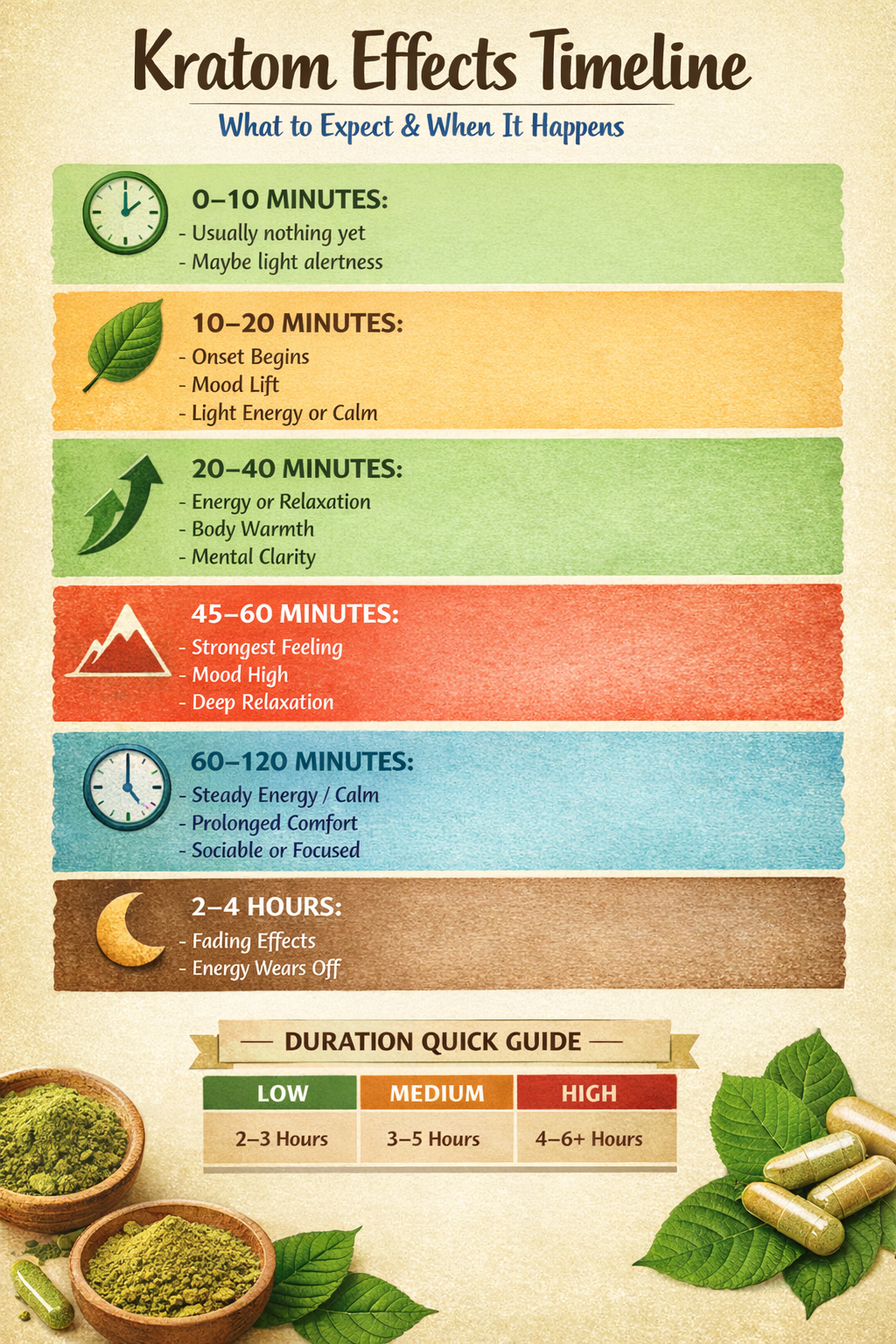 Here’s the typical effects timeline for Kratom — broken down cleanly so you know what usually happens and when.